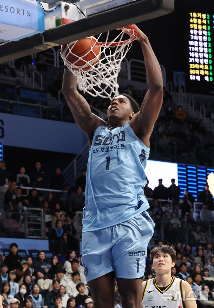 [고양=뉴시스] 배훈식 기자 = 14일 오후 경기 고양시 고양 소노 아레나에서 열린 2025~2026시즌 LG전자 프로농구 고양 소노와 창원 LG의 경기, 4쿼터 소노 나이트가 덩크슛을 하고 있다. 2025.12.14. [email protected]