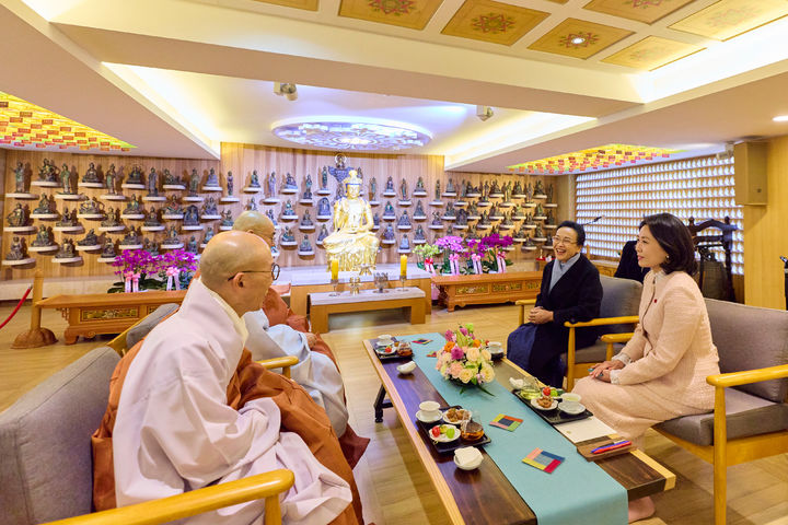 [서울=뉴시스] 김혜경 여사가 14일 서울 종로구 조계사에서 통룬 시술릿 라오스 국가주석과 함께 공식 방한한 날리 시술릿 여사와 함께 조계종 기획실장 묘장 스님, 부주지 탄보 스님과 면담하고 있다. (사진=대통령실 제공) 2025.12.14. [email protected]