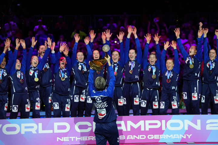 [로테르담=AP/뉴시스] 노르웨이 선수들이 14일(현지 시간) 네덜란드 로테르담 아호이에서 열린 제27회 국제핸드볼연맹(IHF) 세계 여자 핸드볼 선수권대회에서 우승, 시상대에 올라 환호하고 있다. 노르웨이는 결승에서 독일을 23-20으로 꺾고 정상에 올랐다. 2025.12.15.