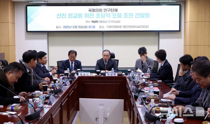 [서울=뉴시스] 조성봉 기자 = 위성락 대통령실 국가안보실장이 15일 오전 서울 여의도 국회 의원회관 간담회의실에서 열린 선진 외교를 위한 초당적 포럼 조찬 간담회에서 발제를 하고 있다. 2025.12.15. [email protected]