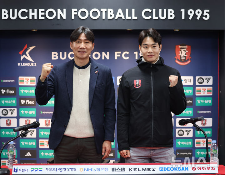 [인천=뉴시스] 전진환 기자 = 이영민(왼쪽) 부천FC1995 감독과 한지호 선수가 15일 오후 부천 원미구 부천종합운동장에서 열린 창단 첫 K리그1 승격 기자회견를 마치고 파이팅을 외치며 기념촬영을 하고 있다. 2025.12.15. [email protected]