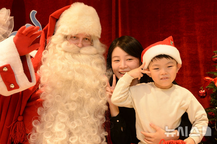 [울산=뉴시스] 배병수 기자 = 울산을 찾은 핀란드공인 산타클로스가 15일 울산 남구 롯데백화점8층 문화센터에서 시민들과 기념촬영을 하고 있다[email protected].