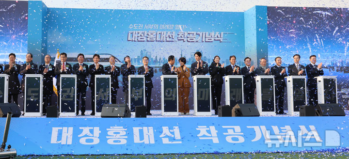 [부천=뉴시스] 전진환 기자 = 김동연(왼쪽 열번째) 경기도지사, 김용석(오른쪽 열번째) 국토교통부 대도시권광역교통위원장 등 참석 내빈들이 15일 오후 부천 오정구 오정대공원에서 열린 광역철도 '대장홍대선' 착공기념식에서 착공 기념 세레머니 후 박수치고 있다. 2025.12.15. [email protected]