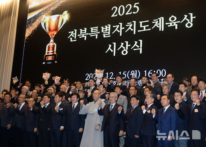[전주=뉴시스] 김얼 기자 = '2025 전북체육상 시상식'이 열린 15일 전북 전주시 전주더메이호텔에서 참석자들이 기념촬영을 하고 있다. 2025.12.15. [email protected]
