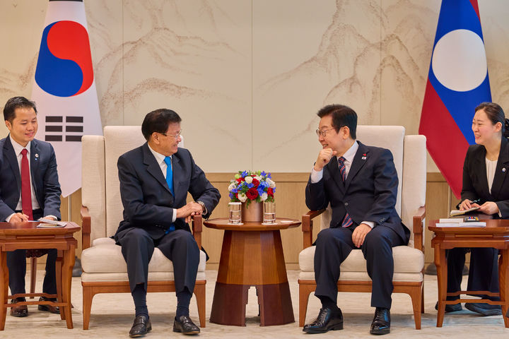 [서울=뉴시스] 최동준 기자 = 이재명 대통령과 통룬 시술릿 라오스 국가주석이 15일 서울 용산 대통령실에서 한-라오스 소인수 정상회담을 하고 있다. (사진=대통령실 제공) 2025.12.15. [email protected] *재판매 및 DB 금지