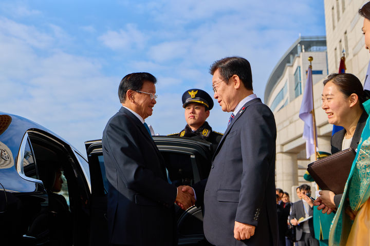 [서울=뉴시스] 최동준 기자 = 이재명 대통령이 15일 한-라오스 정상회담을 하기 위해 서울 용산 대통령실 청사에 도착한 통룬 시술릿 라오스 국가주석을 영접하고 있다. (사진=대통령실 제공) 2025.12.15. [email protected]