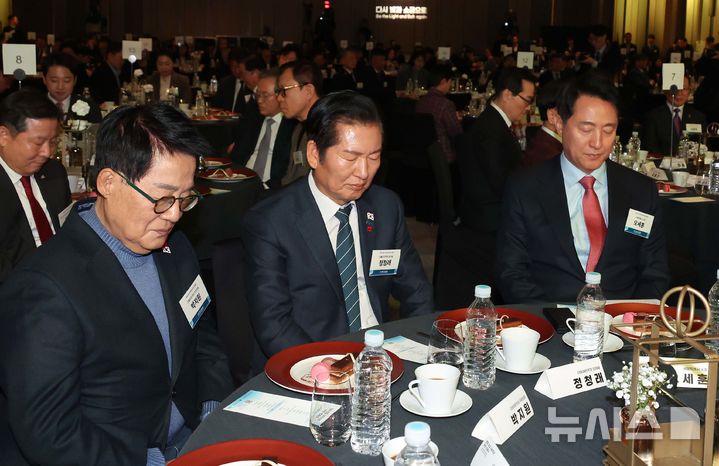 [서울=뉴시스] 국회사진기자단 = 더불어민주당 박지원(왼쪽부터) 의원, 정청래 대표, 오세훈 서울시장이 15일 오후 서울 여의도 페어몬트 앰배서더 서울 그랜드볼룸에서 열린 한국 선교 140주년 비전 선포식에서 기도를 하고 있다. 2025.12.15. [email protected]