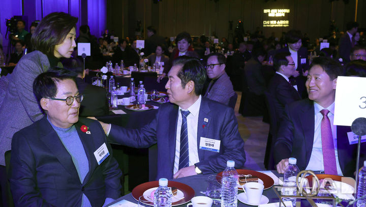 [서울=뉴시스] 국회사진기자단 = 정청래 더불어민주당 대표와 나경원 국민의힘 의원이 15일 오후 서울 여의도 페어몬트 앰배서더 서울 그랜드볼룸에서 열린 한국 선교 140주년 비전 선포식에서 악수하고 있다. 2025.12.15. [email protected]