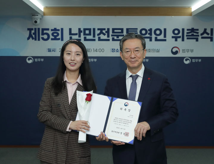 [서울=뉴시스] 정성호 법무부 장관이 15일 경기 과천시 정부과천청사 법무부에서 열린 제5회 난민전문통역인 위촉식에 참석해 이지현 씨에게 위촉장을 수여한 뒤 기념촬영 하고 있다. (사진=법무부 제공) 2025.12.16. [email protected] *재판매 및 DB 금지