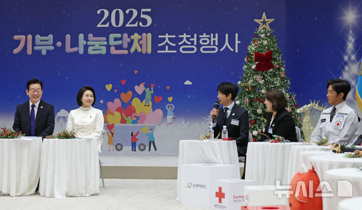 [서울=뉴시스] 최동준 기자 = 이재명 대통령과 김혜경 여사가 16일 용산 대통령실에서 열린 기부나눔 초청행사에서 굿네이버스 친선대사 배우 최수종의 발언을 듣고 있다. (대통령실통신사진기자단) 2025.12.16. [email protected]