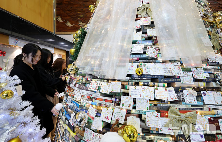 [경산=뉴시스] 이무열 기자 = 16일 경북 경산시 대구대학교 경산캠퍼스 창파도서관에서 학생들이 북(Book) 트리에 새해 소원을 담은 소원지를 매달고 있다.