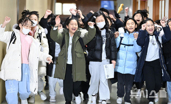 [수원=뉴시스] 김종택 기자 = 겨울방학식이 열린 16일 경기 수원시 영통구 잠원초등학교에서 4학년8반 학생들이 환하게 웃으며 하교하고 있다. 2025.12.16. [email protected]