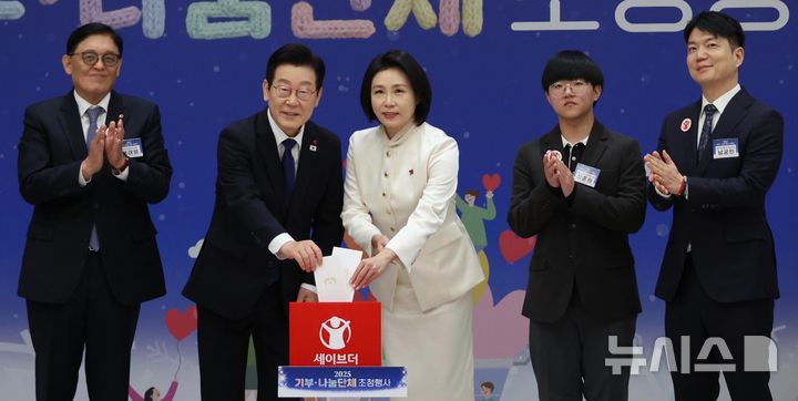 [서울=뉴시스] 최동준 기자 = 이재명 대통령과 김혜경 여사가 16일 용산 대통령실에서 열린 2025년 기부·나눔단체 초청행사에서 세이브더칠드런에 성금을 전달하고 있다. 왼쪽부터 정태영 세이브더칠드런 코리아 총장, 이 대통령, 김 여사, 장준희 세이브더칠드런 후원아동, 남궁인 홍보대사. (대통령실통신사진기자단) 2025.12.16. [email protected]