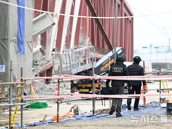 [광주=뉴시스] 이현행 기자 = 광주경찰청 광주대표도서관 공사현장 붕괴사고 수사본부 등 유관기관이 16일 오후 광주 서구 치평동 광주대표도서관 붕괴 사고 현장에서 1차 합동 감식에 나서고 있다. 2025.12.16. [email protected]