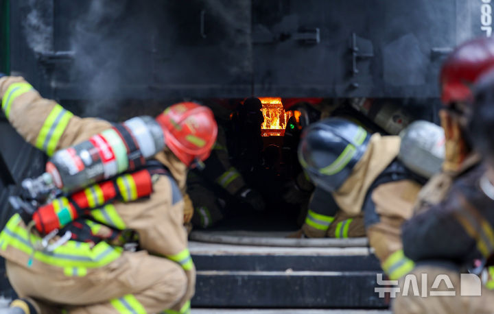 [대구=뉴시스] 이무열 기자 = 16일 대구 동구 대구소방교육훈련센터 실화재훈련장에서 열린 실화재 종합훈련 역량강화 특별 교육에서 소방관들이 훈련 시연을 하고 있다.