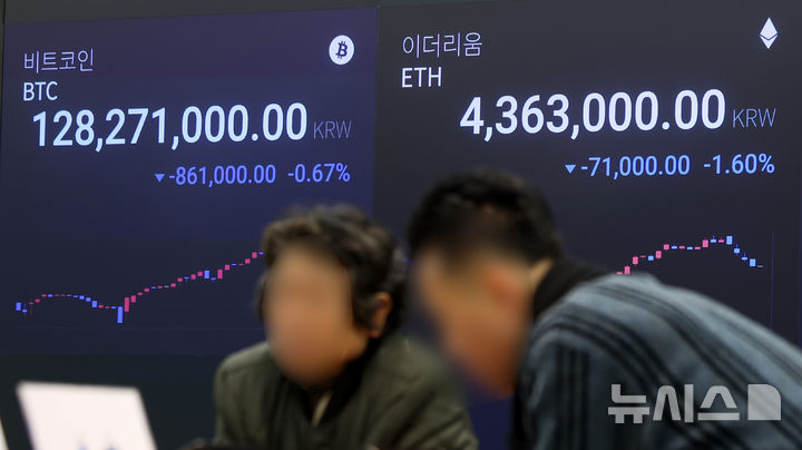 [서울=뉴시스] 김선웅 기자 = 비트코인이 미국의 긴축 기조 지속 및 일본의 금리 인하 기대 약화 등 이유로 1억2800만원대로 하락했다. 16일 오후 4시 38분 기준 가상자산 거래소 업비트에서 비트코인은 24시간 전보다 0.76% 하락한 1억2800만원대에 거래되고 있다. 달러 기준으로는 86498원대에 거래 중이다. 16일 서울 강남구 업비트 고객센터 시황판에서 비트코인 가격이 표시되고 있다. 2025.12.16. [email protected]