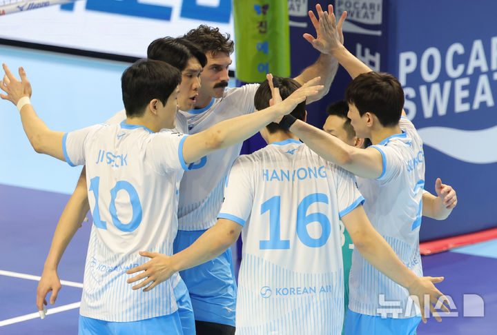 [인천=뉴시스] 홍효식 기자 = 16일 오후 인천 계양체육관에서 열린 2025-2026 V-리그 남자부 3라운드 대한항공과 현대캐피탈의 경기, 대한항공 선수들이 득점한 뒤 기뻐하고 있다. 2025.12.16. [email protected]