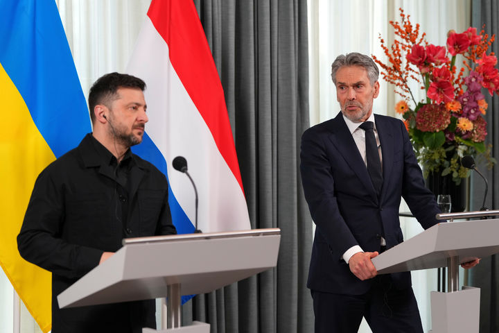 [헤이그=AP/뉴시스] 볼로디미르 젤렌스키(왼쪽) 우크라이나 대통령과 딕 스호프 네덜란드 총리가 16일(현지 시간) 네덜란드 헤이그에서 회담 후 공동 기자회견하고 있다. 2025.12.17.