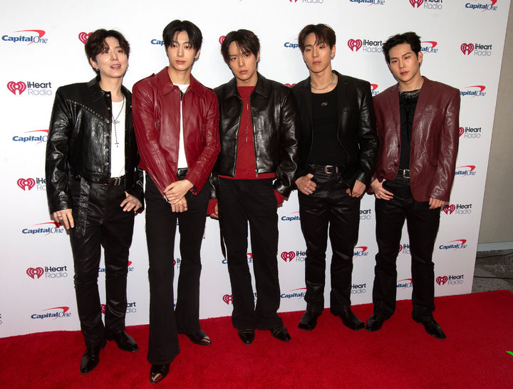 [워싱턴=AP/뉴시스] 몬스타엑스의 기현(왼쪽부터), 형원, 민혁, 셔누, 주헌이 16일(현지 시간) 미국 워싱턴의 캐피털 원 아레나에서 열리는 '2025 아이하트라디오 징글볼 투어' 행사에 도착해 포토타임을 갖고 있다. 몬스타엑스는 앞선 15일에 필라델피아주 엑스피니티 모바일 아레나에서 열린 징글볼 투어 무대에도 올랐다.2025.12.17.