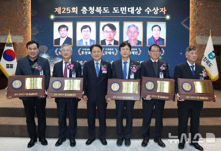 [청주=뉴시스] 17일 충북 청주시 상당구 문화동 충북도청 대회의실에서 열린 제25회 충북도민대상 시상식에서 김영환 충북지사와 수상자들이 기념촬영하고 있다. 왼쪽부터 한효동 청주시응급구조지원 민방위대장, 이재진 충북경제포럼회장, 김 지사, 홍상표 풀꿈환경재단 이사장, 강대식 충북문인협회장, 임대경 농업기술자협회 충북도연합회장. (사진=충북도 제공) 2025.12.17. [email protected]