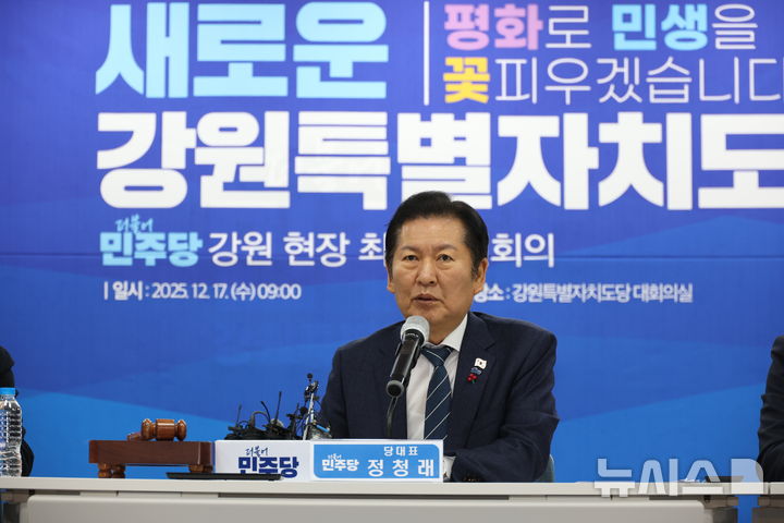 [춘천=뉴시스] 김금보 기자 = 정청래 더불어민주당 대표가 17일 오전 강원특별자치도 춘천시 더불어민주당 강원도당에서 열린 현장 최고위원회의에서 발언을 하고 있다. 2025.12.17. [email protected]