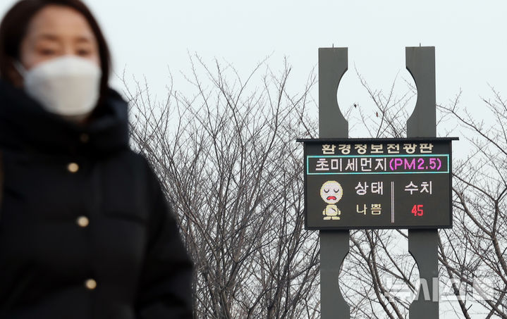 [인천=뉴시스] 전진환 기자 = 수도권이 초미세먼지 나쁨을 보인 17일 오전 인천 남동구 중앙공원에 설치된 환경정보전광판에 초미세먼지 수준이 나쁨을 나타내고 있다. 2025.12.17. [email protected]