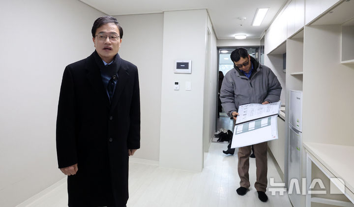 [서울=뉴시스] 김선웅 기자 = 서울시장 선거 출마를 선언한 박주민 더불어민주당 국회의원이 ‘청년, 신혼부부, 세입자 위한 6대 주거정책'을 발표한 17일 서울 구로구 오류1동 행복주택을 방문해 내부 시설을 살펴보고 있다. 2025.12.17. [email protected]