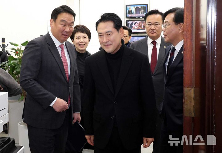 [서울=뉴시스] 조성봉 기자 = 장동혁 국민의힘 대표가 17일 오후 서울 여의도 국회 원내대표실에서 송언석 원내대표 등 지도부와 면담을 마치고 의총장으로 가기 위해 나오고 있다. 2025.12.17. [email protected]