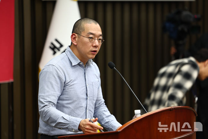 [서울=뉴시스] 김명년 기자 = 노정태 작가가 17일 오후 서울 여의도 국회에서 열린 국민의힘 정책의원총회에서 강연하고 있다. 2025.12.17. [email protected]