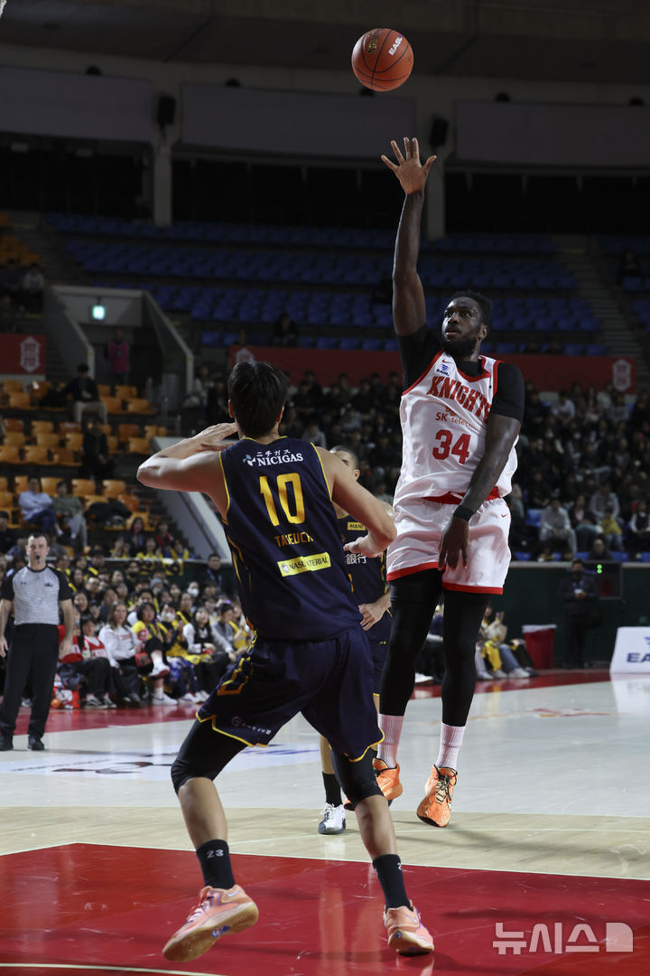 [서울=뉴시스] 김근수 기자 = 17일 오후 서울 송파구 잠실학생체육관에서 열린 2025-2026 동아시아슈퍼리그(EASL) 서울 SK나이츠와 일본 우츠노미야 브렉스의 경기, SK 자밀 워니가 슛을 시도하고 있다. 2025.12.17. [email protected]