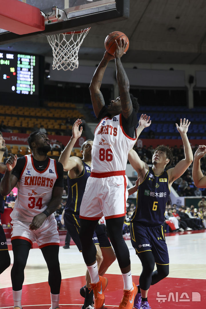 [서울=뉴시스] 김근수 기자 = 17일 오후 서울 송파구 잠실학생체육관에서 열린 2025-2026 동아시아슈퍼리그(EASL) 서울 SK나이츠와 일본 우츠노미야 브렉스의 경기, SK 대릴 먼로가 슛을 시도하고 있다. 2025.12.17. [email protected]