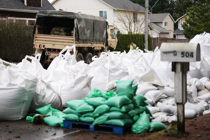 [퍼시픽=AP/뉴시스] 17일(현지 시간) 미 워싱턴주 퍼시픽에서 주 방위군 대원들이 폭우와 화이트강 제방 붕괴로 발생한 홍수 지역에서 모래주머니를 옮기고 있다. 2025.12.18.