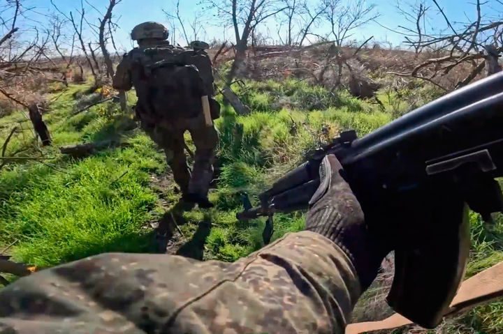 [훌랴이폴레=AP/뉴시스] 17일(현지 시간) 러시아 국방부 공보실이 제공한 영상 캡처 사진에 러시아 군인들이 우크라이나 자포리자주 훌랴이폴레 일대에서 우크라이나군 진지를 향해 전진하고 있다. 2025.12.18.