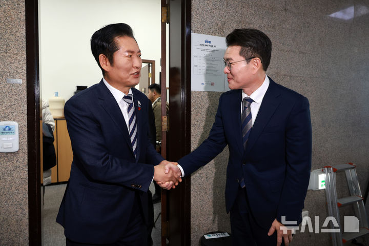 [서울=뉴시스] 고승민 기자 = 정청래 더불어민주당 대표와 정원오 성동구청장이 18일 서울 여의도 국회에서 면담을 마친 뒤 인사하고 있다. 2025.12.18. [email protected]