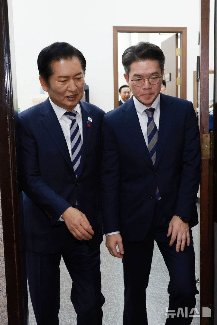 [서울=뉴시스] 고승민 기자 = 정청래 더불어민주당 대표와 정원오 성동구청장이 18일 서울 여의도 국회 당대표실에서 면담을 마친 뒤 대표실을 나서고 있다. 2025.12.18. [email protected]