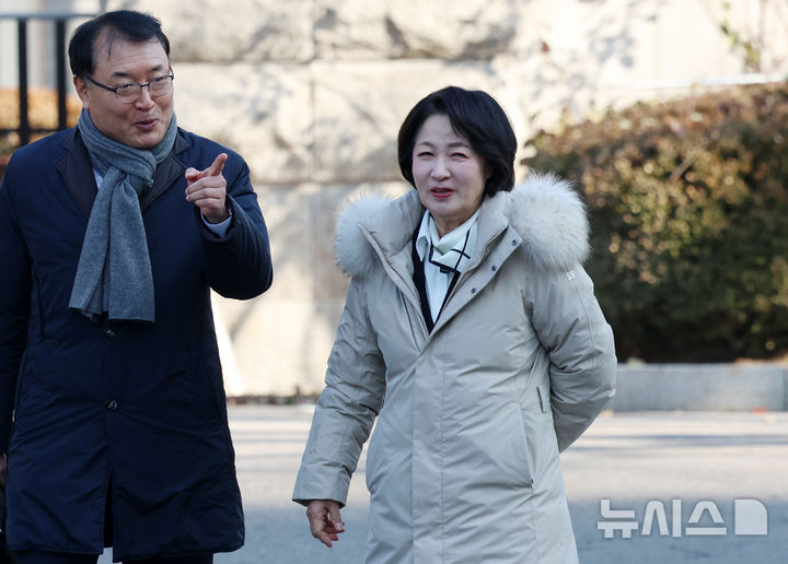 [서울=뉴시스] 조성우 기자 = 추미애(오른쪽) 국회 법제사법위원회 위원장이 18일 오후 서울 종로구 헌법재판소 대심판정에서 열린 조지호 경찰청장 탄핵심판 사건 선고기일에 참석하고 있다.
