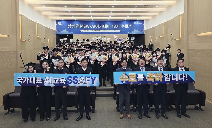 [서울=뉴시스] 김영훈 고용노동부 장관과 박승희 삼성전자 CR담당 사장 등이 18일 서울 강남구 삼성청년SW·AI아카데미(SSAFY) 서울캠퍼스에서 열린 SSAFY 13기 수료식에 참석한 수료생들과 기념촬영 하고 있다. (사진=고용노동부 제공) 2025.12.18. [email protected] *재판매 및 DB 금지