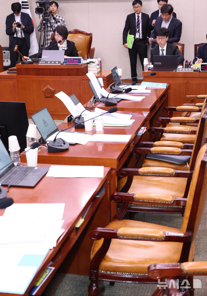 [서울=뉴시스] 김금보 기자 = 국민의힘 의원들이 18일 서울 여의도 국회에서 열린 법제사법위원회 전체회의에서 방송미디어통신위원회의 설치 및 운영에 관한 법률 일부개정법률안(대안)(위원장), 방송법 일부개정법률안(대안)(위원장), 정보통신망 이용촉진 및 정보보호 등에 관한 법률 일부개정법률안(대안)(위원장) 의결에 반대하며 회의장에서 퇴장해 의석이 비어있다. 2025.12.18. [email protected]