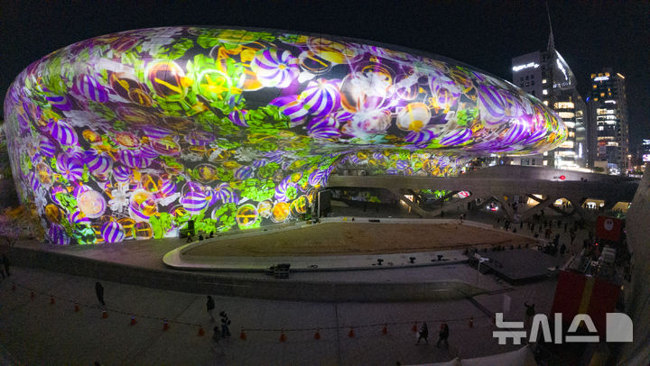 [서울=뉴시스] 김근수 기자 = 18일 저녁 서울 중구 동대문디자인플라자(DDP) 외벽에 '서울라이트 DDP 2025 겨울'을 맞아 미디어아트 '서울풀 윈터' 작품이 나오고 있다. 2025.12.18. [email protected]
