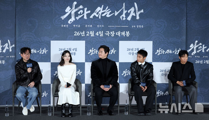 [서울=뉴시스] 김혜진 기자 = 장항준(왼쪽 첫번째) 감독이 19일 오전 서울 용산구 CGV 용산아이파크몰에서 열린 영화 '왕과 사는 남자'(감독 장항준) 제작보고회에서 인사말을 하고 있다. 2025.12.19. [email protected]