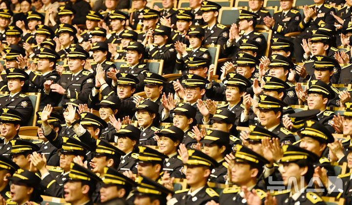 [수원=뉴시스] 김종택 기자 = 19일 경기 수원시 팔달구 경기아트센터에서 열린 제79기 경기도 신임 소방공무원 임용식에서 소방대원들이 축하공연을 관람하고 있다. 2025.12.19. [email protected]