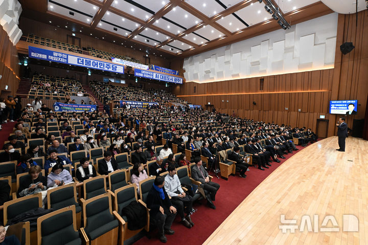 [광주=뉴시스] 이영주 기자 =19일 오후 광주 북구 전남대학교 민주마루에서 정청래 더불어민주당 당대표의 'APEC 국민성과보고 및 민주당의 미래 비전' 특강이 열리고 있다. 2025.12.19. [email protected]