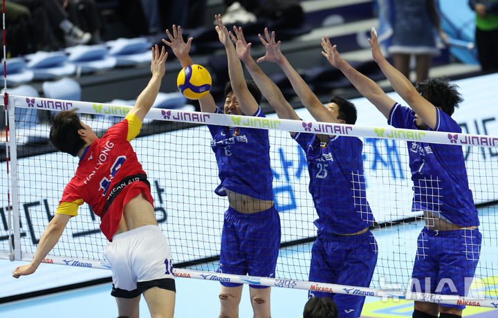 [인천=뉴시스] 황준선 기자 = 19일 인천계양체육관에서 열린 진에어 2025~2026 V-리그 남자부 한국전력 빅스톰과 대한항공 점보스의 경기, 한국전력 선수들이 대한항공 정한용의 공격을 막고 있다. 2025.12.19. [email protected]