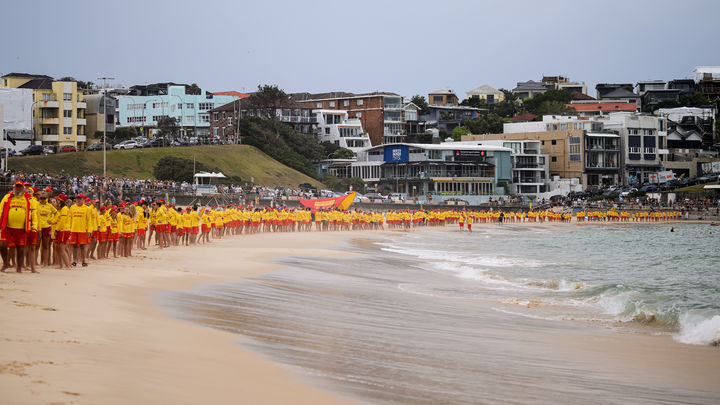 [시드니=AP/뉴시스] 20일(현지 시간) 호주 시드니 본다이비치에서 인명구조대원들이 지난 14일 발생한 총격 사건 희생자들을 추모하기 위해 해안선을 따라 줄지어 서서 3분간의 묵념을 하고 있다. 2025.12.20.
