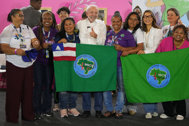 [상파울루=AP/뉴시스] 루이스 이나시우 룰라 다시우바(가운데) 브라질 대통령이 19일(현지 시간) 상파울루에서 열린 크리스마스 행사에서 재활용 쓰레기 수거 노동자 가족들과 함께 기념 촬영을 하고 있다. 2025.12.20.