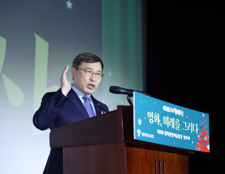 [서울=뉴시스] 황준선 기자 = 정근식 서울시교육감이 지난 19일 서울 종로구 씨네큐브 광화문에서 열린 '2025 협력종합예술활동 영화제'에서 개회사를 하고 있다. (사진=서울시교육청 제공) 2025.12.20. [email protected] *재판매 및 DB 금지