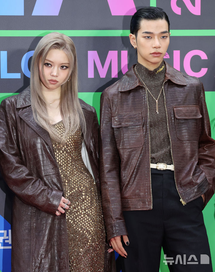 [서울=뉴시스] 김혜진 기자 = 그룹 올데이프로젝트 베일리(왼쪽), 타잔이 20일 오후 서울 구로구 고척스카이돔에서 열린 2025 멜론뮤직어워드(MMA2025) 레드카펫을 밟고 있다.