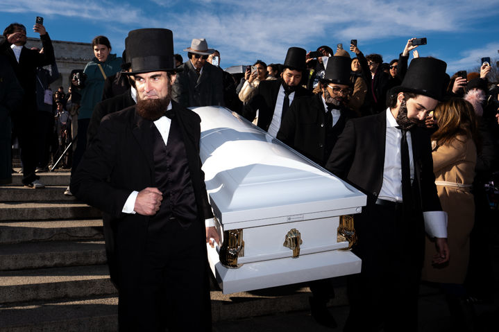 [워싱턴=AP/뉴시스] 20일(현지 시간) 미국 워싱턴 링컨기념관 앞에서 올해 초 주조가 중단된 1센트 동전(페니)의 모의 장례식이 열려, 에이브러햄 링컨 전 대통령 복장을 한 남성들이 관을 운구하고 있다. 도널드 트럼프 미국 대통령은 지난 2월 “주조 비용이 2센트를 넘는 ‘페니’ 생산은 낭비”라며 주조 중단을 지시한 바 있다. 1센트 동전에는 링컨 대통령의 초상이 디자인돼 있다. 2025.12.21.