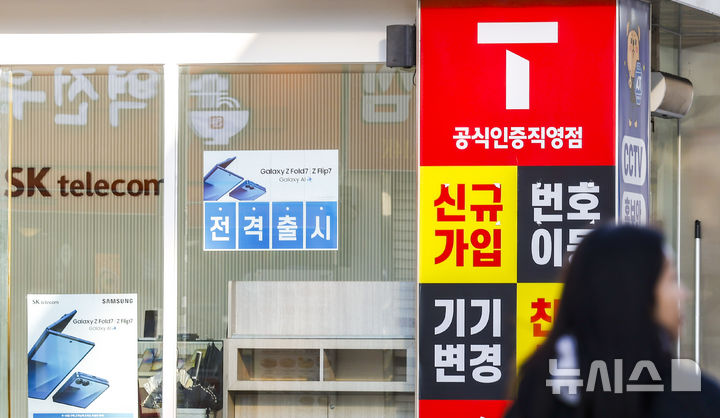 [서울=뉴시스] 정병혁 기자 = 21일 서울시내 SK텔레콤 매장 앞을 시민들이 지나고 있다.