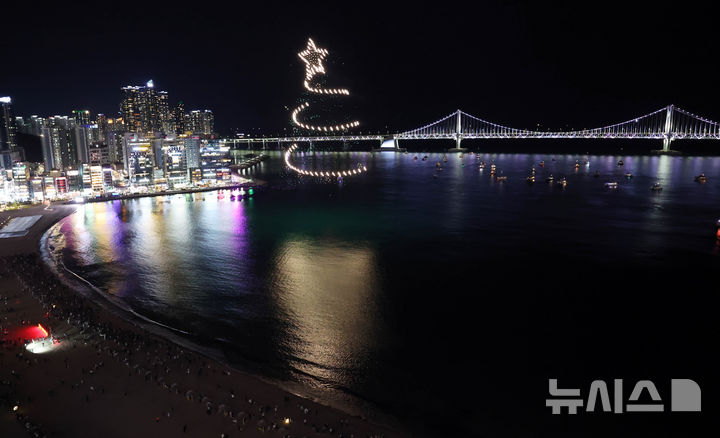 [부산=뉴시스] 하경민 기자 = 21일 부산 수영구 광안리해수욕장 일대에서 '미리 메리크리스마스'를 주제로 한 '광안리 M 드론라이트쇼'가 펼쳐지고 있다. 2025.12.21. [email protected]